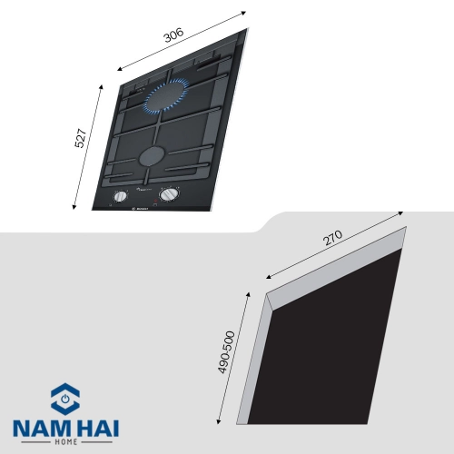 Bếp gas âm Bosch PRB3A6D70 có 2 vùng nấu được sắp xếp theo chiều dọc. Một vùng nấu nằm phía trước và một vùng nấu nằm phía sau. Bếp phía trước có công suất tối đa 1900W. Bếp phía sau có công suất tối đa 2800W. Sản phẩm thiết kế theo hình chữ nhật đứng ( kiểu Domino) rất gọn gàng với kích cỡ 45 x 306 x 527 mm.