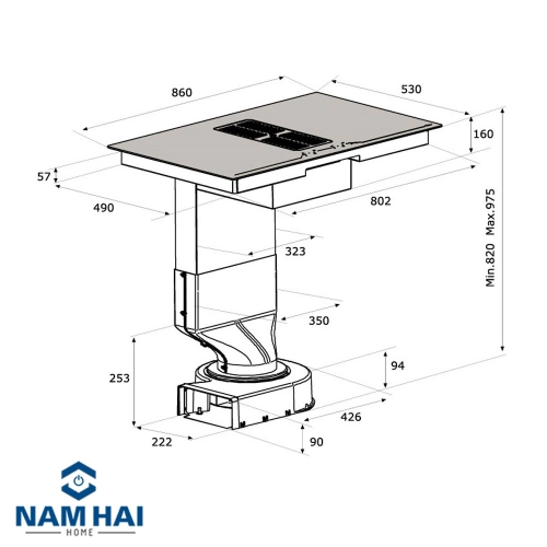 Máy hút và khử mùi bằng than hoạt tính và ống thoát ra ngoài, tấm lưới lọc mỡ và ngăn ẩm bằng hợp kim nhôm nhiều lớp. Máy hút mùi của bếp cũng có chức năng hẹn giờ thông minhvà chức năng thông báo cần phải vệ sinh lưới lọc và thay than hoạt tính. Công suất hút là 750 m3/h, đặc biệt độ ồn : 59 dB trong khoảng dễ chịu.