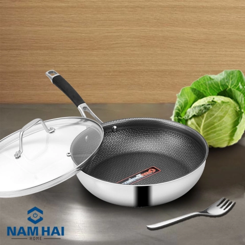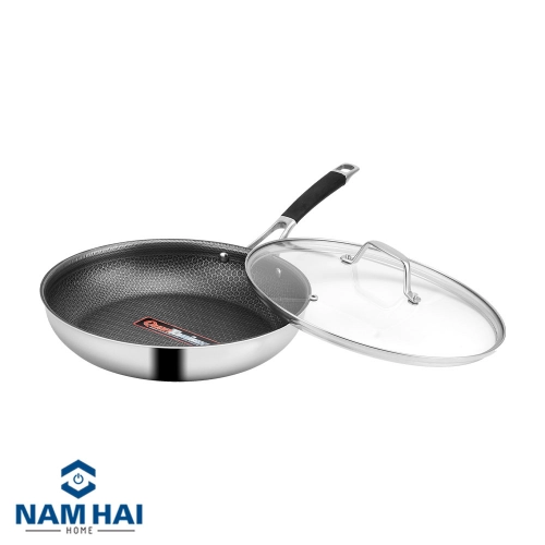 Chảo có cấu trúc 3 lớp toàn thân giúp truyền và giữ nhiệt tối ưu, tiết kiệm năng lượng. Lớp trong cùng inox SUS 304 – 18/10 dày 0.6mm tiếp xúc an toàn thực phẩm. Ở giữa là lớp nhôm chuyên dụng dày 1.5mm giúp tản nhiệt đồng đều. Lớp ngoài cùng inox 430 dày 0.5mm tiếp nhận cảm ứng từ. Vung kính cường lực dày 4mm chịu lực và chịu nhiệt độ cao. Tay cầm inox đúc chắc chắn và được gắn Silicon cách nhiệt cao cấp. Lòng chảo sử dụng men chống dính 3 lớp siêu bền Quantum của hãng Whitford Eclipse chịu được 34.000 lần chà nhám được sản xuất tại Mỹ. Chảo có đường kính 28cm với thể tích 3,38l rất phù hợp với bữa ăn của gia đình.