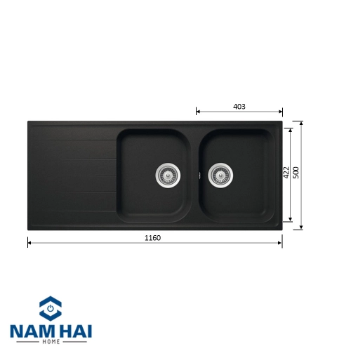 Chậu rửa bát Hafele HS18 GED2R80 thiết kế 2 hố 1 bàn chờ với kích thước Kích thước chậu rửa là 1160D x 500 Rmm. Độ sâu bồn là 204mm. Với độ dày lý tưởng 1,2mm tạo độ chắc chắn tuyệt vời cho chậu.