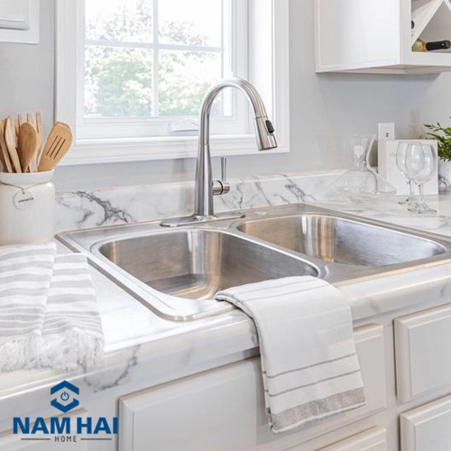 Rổ lọc rác bằng inox ngăn chặn các cặn bẩn lớn làm tắc nghẽn đường ống, giúp thoát nước nhanh. Lỗ chờ gắn vòi nước hoặc lắp bình xà bông giúp việc lấy nước uống, chất tẩy rửa đơn giản và nhanh chóng.