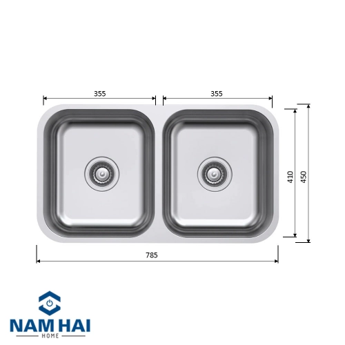 Chậu inox HS20-SSN2R90S có kích thước ngăn phải và ngăn trái bằng nhau dài 35.5cm - rộng 41cm, độ sâu 18cm rộng rãi, có thể rửa nhiều đồ dùng cùng lúc.
