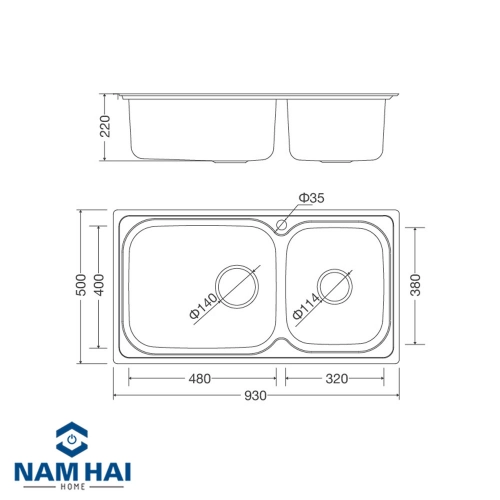 Chậu với kích thước: W930x D500 x H200mm phù hợp lắp đặt với mọi không gian bếp.
