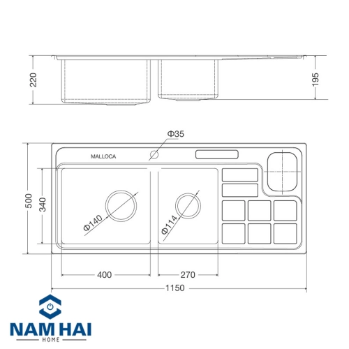 Chậu với kích thước: W1150 x D500 x H230mm phù hợp lắp đặt với mọi không gian bếp.