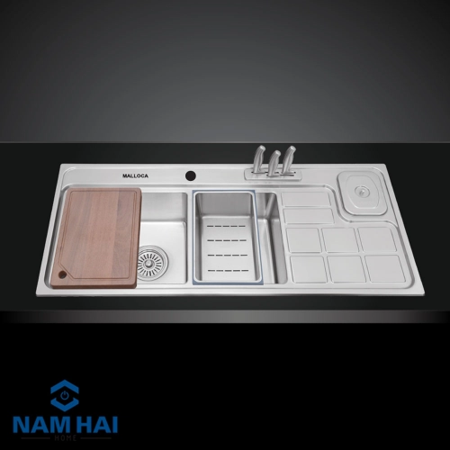 Chậu rửa chén Malloca MS 8817 là dòng chậu rửa 2 hố và 1 bàn chờ cánh phải tiện lợi. Chậu được thiết kế thêm 01 ngăn đựng dao và 01 hố rác. Cùng với đó là phụ kiện gồm 01 Thớt gỗ Malloca + 01 Rổ inox + 01 Bộ dao Malloca + Bộ xả