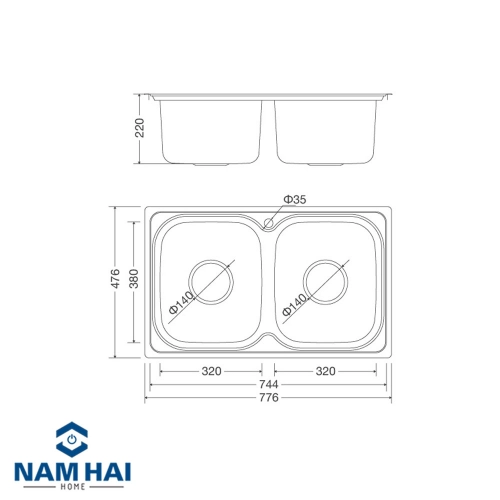 Chậu với kích thước: W776x D476 x H220mm phù hợp lắp đặt với mọi không gian bếp.