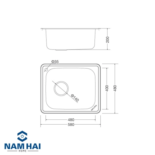 Chậu với kích thước: W580 x D480 x H200mm phù hợp lắp đặt với mọi không gian bếp.
