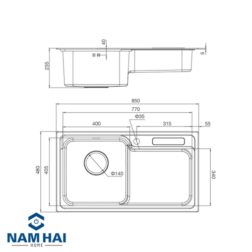 Chậu với kích thước: W850 x D480 x H235mm phù hợp lắp đặt với mọi không gian bếp.