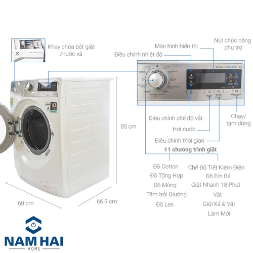 Công nghệ EcoInverter tiết kiệm điện nước, Khóa trẻ em, Khử mùi kháng khuẩn, Chế độ trì hoãn khởi động |