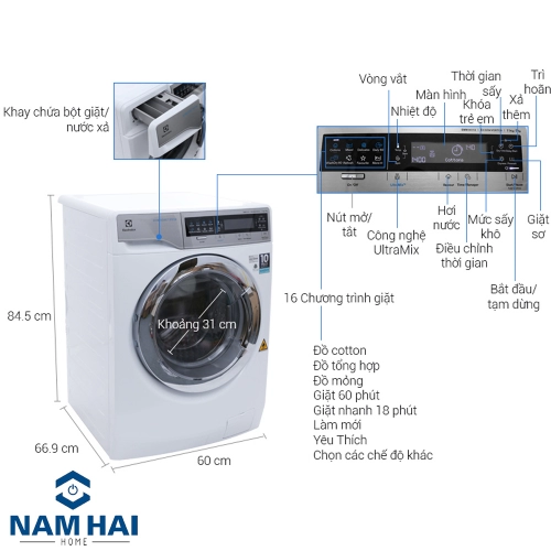 Máy giặt sấy Electrolux EWW14113 thương hiệu nổi tiếng từ Thuỵ Điển, được sản xuất theo dây chuyền công nghệ hiện đại nhập khẩu nguyên chiếc từ Thái Lan. Sản phẩm với công nghệ giặt đa năng thông minh, hoạt động mạnh mẽ, bền bỉ, và tiết kiệm điện năng. Máy giặt sấy Electrolux Inverter 11 kg EWW14113 sở hữu thiết kế mới mẻ, hiện đại cùng đường nét góc cạnh tinh tế, vỏ ngoài chắc chắn mang gam màu trắng trang nhã giúp tô điểm cho không gian nội thất sang trọng của gia đình bạn. Với khối lượng giặt lên đến 11 kg và khối lượng sấy tối đa là 7 kg, với công nghệ sấy ngưng tụ tiện lợi, an toàn cho người dùng. Quần áo sau khi sấy bằng máy giặt Inverter có tính năng sấy sẽ không khô hoàn toàn, bạn nên phơi ngoài gió thêm 1 chút nhé. Công nghệ Inverter tiên tiến tích hợp trong máy giặt Electrolux cho phép tiết kiệm đến 75% điện năng mỗi lần giặt, giúp tiết kiệm chi phí sinh hoạt cho gia đình bạn mà vẫn đảm bảo được chức năng giặt sạch hiệu quả. Ngoài ra, công nghệ Inverter còn giúp cho máy giặt hoạt động êm ái bền bỉ, giảm rung lắc, tránh sờn rách trên quần áo và tăng độ bền cho máy giặt. Máy giặt sấy Electrolux Inverter EWW14113 được trang bị công nghệ UltraMix cho phép hòa tan chất giặt tẩy nhanh chóng hiệu quả, giúp nước giặt thấm sâu vào từng sợi vải, tiết kiệm thời gian giặt mà vẫn cho hiệu quả giặt giũ tối ưu. Công nghệ UltraMix cho khả năng bảo vệ màu vải tốt hơn 31%, bạn sẽ không còn lo lắng về quần áo bị phai màu khi giặt.. Công nghệ giặt hơi nước Vapour Care là một trong những công nghệ tiên tiến nhất được tích hợp trong các sản phẩm máy giặt Electrolux. Công nghệ này giúp máy giặt đánh bật các vết bẩn cứng đầu, loại bỏ 99,9% vi khuẩn và các tác nhân gây dị ứng bám trên quần áo, làm mềm sợi vải, giúp quần áo của gia đình bạn luôn sạch sẽ, mềm mại như mới. Máy giặt sấy Electrolux EWW14113 còn được trang bị công nghệ làm mới quần áo Vapour Refresh thông minh có khả năng làm mềm, giảm nhăn quần áo trong vòng 30 phút, giúp những bộ quần áo cất trong tủ lâu ngày của gia đình bạn mềm mại, thơm mát như mới. Chức năng quản lí thời gian Time Manager Giúp bạn có thể điều chỉnh thời gian giặt phù hợp với từng loại quần áo dày hay mỏng khác nhau. Lồng giặt Lily được thiết kế giúp dễ dàng giặt sạch những vết bẩn cứng đầu. Bên cạnh đó, lồng giặt được làm bằng thép không gỉ với hệ thống lỗ nhỏ có tác dụng làm giảm độ co giãn của vải, chống bào mòn, tăng hiệu quả giặt và làm mới quần áo. Vận hành cực êm giảm thiểu tiếng ồn không ảnh hưởng tới thời gian nghỉ ngơi của gia đình bạn Với những chiếc máy giặt cửa trước thông thường, bạn sẽ không thể cho thêm quần áo bỏ quên vào máy giặt khi đang vận hành. Tuy nhiên, chức năng Add Cloths trên máy giặt sấy này cho phép bạn cho thêm quần áo bỏ quên vào máy giặt đang hoạt động trong vòng 10 – 15 phút đầu tiên. Ngoài những tính năng ưu việt trên, máy giặt sấy Electrolux Inverter 11kg EWW14113 còn có rất nhiều tiện ích thông minh khác là khóa trẻ em, hẹn giờ giặt xong, chế độ trì hoãn khởi động,… đảm bảo mang đến sự thoải mái, yên tâm cho bạn khi sử dụng. Với nhiều chương trình giặt đa dạng như đồ cotton, đồ len, giặt tiết kiệm,… chiếc máy giặt này sẽ giúp bạn thoải mái lựa chọn chế độ giặt phù hợp với quần áo của gia đình mình. Máy giặt sấy Electrolux Inverter 11 kg EWW14113 luôn là sự lựa chọn hoàn hảo cho mọi gia đình. Máy mang thiết kế hiện đại, tích hợp nhiều tính năng thông minh, sản phẩm hứa hẹn mang đến những trải nghiệm tuyệt vời cho người sử dụng. Máy được bảo hành chính hãng 2 năm.